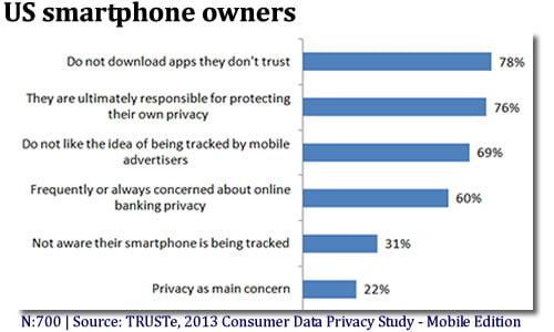 The TRUSTe survey shows that mobile privacy, and by extension security, is a greater concern to many users than other key features such as brand and key physical and tech attributes. Some 80% of the 700 surveyed individuals in the US say that they stay away from apps that are questionable and they don’t trust. The idea of tracking is also cited as undesirable. The chart here summarizes some basic findings.