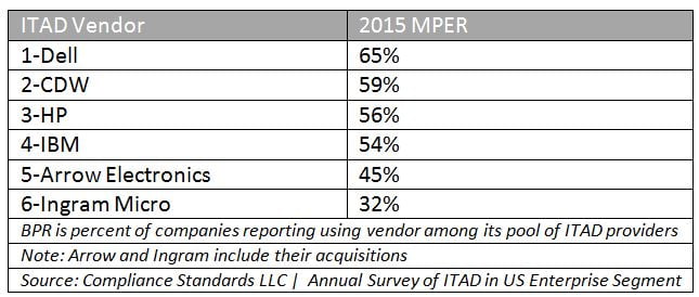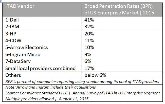 Table 1:  2015 Broad Penetration Rates (BPR) of US’ ITAD Enterprise Market Data shows the percent of companies that vendor has access to. Respondents allowed multiple vendors.