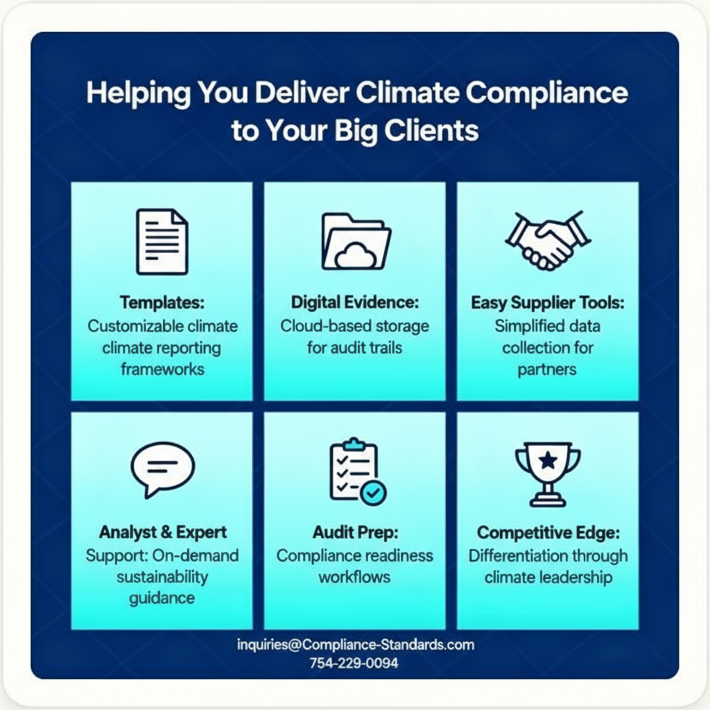 That’s where Compliance Standards comes in. We specialize in making compliance simple, scalable, and genuinely supportive—equipping SMBs with the exact templates, guidance, and expert access needed to meet big-client expectations and regulatory obligations. Whether you need help mapping your asset flows, organizing evidence, or preparing for client assurance reviews, Compliance Standards delivers the practical tools to stay ahead in a fast-evolving climate compliance landscape. As large corporations raise the bar for climate and sustainability reporting, their suppliers must be ready with transparent data, standardized documentation, and audit-ready records. Small and midsize businesses serving major clients often feel overwhelmed by these expectations—but the right tools and guidance make a real difference.